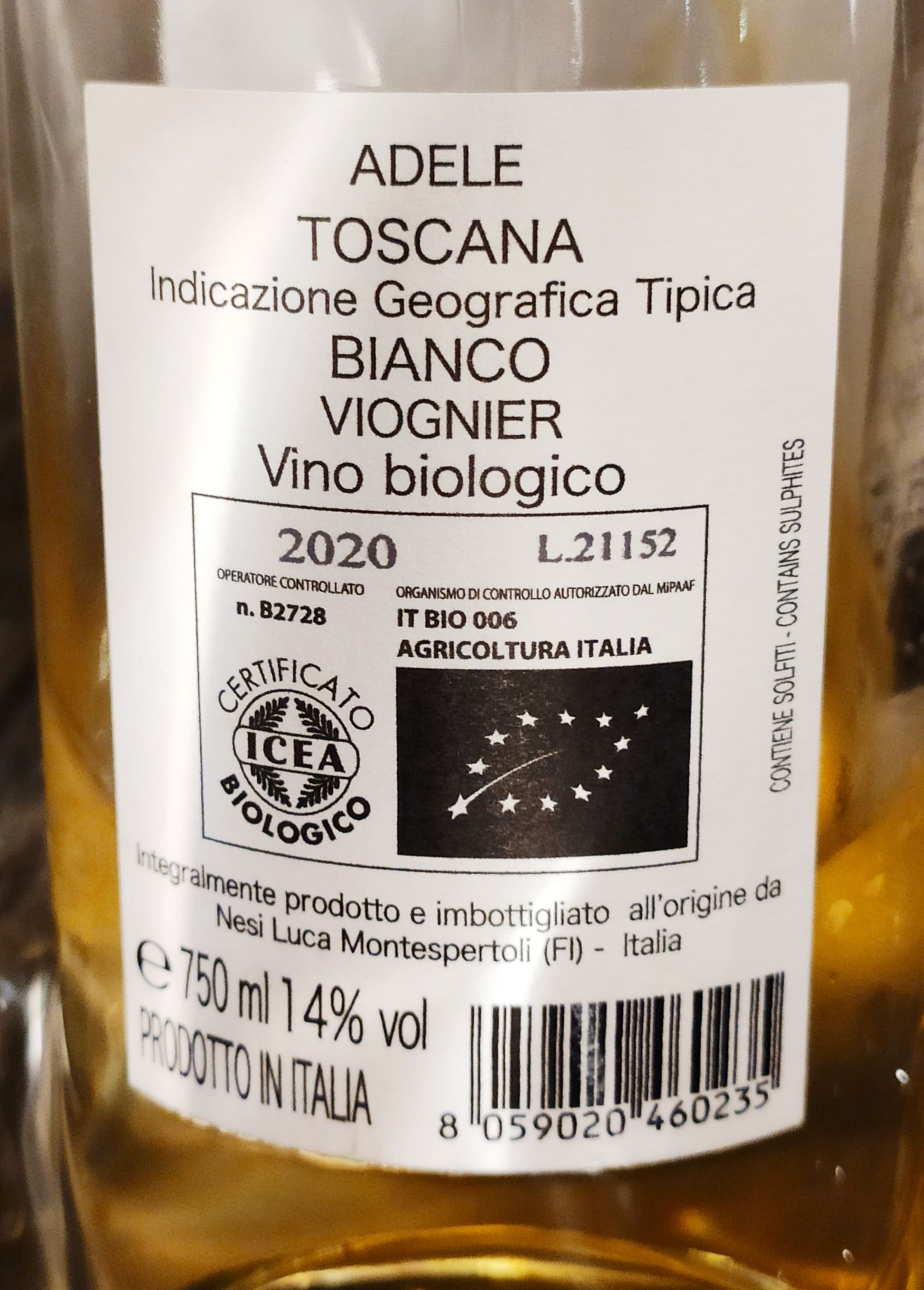 Più morbido e corposo l’Adele Toscana IGT bianco 2020, 100% viognier – come detto – raccolto da un’unica vigna, di soli 5 anni. Il colore è giallo paglierino brillante, gli aromi virano verso il frutto maturo, con graditi cenni di frutta secca, mentre in bocca si affaccia un sentore agrumato, di lime, che equilibra la decisa alcolicità (14°). Adele offre dunque – al suo esordio – un carattere piuttosto marcato, che- come sottolinea Luca – deriva dall’aver portato le uve a pieno sviluppo, ma che che l’azienda proverà ad “ingentilire” con le prossime vendemmie.